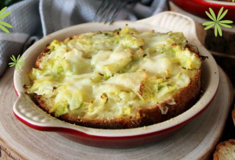 Zuppa calda di verza, formaggio e pane